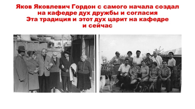 Yakov Yakovlevich Gordon boshidanoq kafedrada do'stlik va hamjihatlik ruhini yaratgan.Bu an'anaga aylangan va hozirda kafedrada shu ruh hukm surmoqda