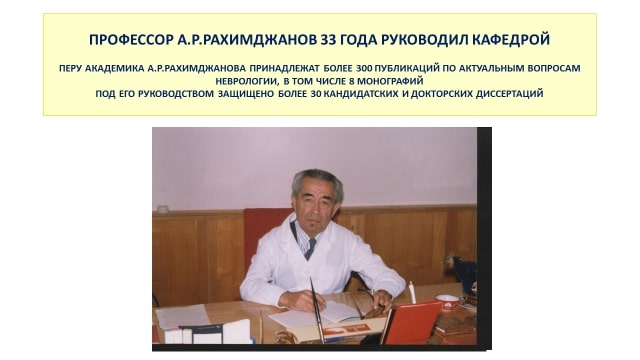 Akademik Abdumannon Raxmonovich Raximjonovning kafedra ishini tashkil etishdagi ulkan xizmatlari va uning klinik asoslari umumiy bo'lib, 2005 yilda kafedraga akademik A.R.Rahimjonov nomi berildi. O'tgan yillar soni kafedrada 10,000 dan ortiq nevropatologlar, 600 dan ortiq klinik ordinatorlar, doktorantlar va aspirantlar tayyorlandi. Kafedra xodimlari tomonidan 500 dan ortiq ilmiy ishlar chop etilgan, 105 ta nomzodlik va 40 ta doktorlik dissertatsiyalari himoyalangan.